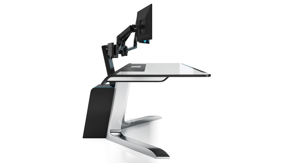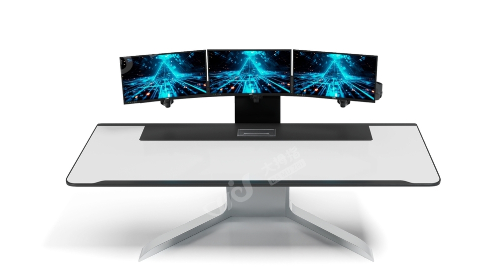 桌面采用平滑的弧形过渡,搭配极具科技感的支撑底座,整体视觉上简洁且富有未来感,符合现代指挥中心、数据中心的审美。